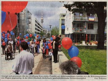 01I07I05 wagnis am ackermannbogen Einweihung der ersten wagnis-Wohnanlage, Eröffnung der Nachbarschaftsbörse und des Speise-Cafés Rigoletto. Adresse: Rosa-Aschenbrenner-Bogen, München (südlich vom Olympiagelände). Wir wünschen unseren Bauherren Alles Gute.