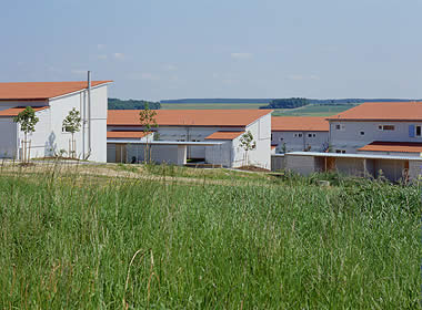 Goldtal, Bad Abbach Ein katholischer Pfarrer ergreift die Initiative, das Evange-lische Siedlungswerk in Bayern übernimmt die Bauherrschaft und die Architektengruppe A2 bekommt den Auftrag, eine Siedlung zu bauen: 27 Wohnungen in Reihenhäusern mit sämtlichen Leistungsphasen der Honorarordnung. Das Selbstverständliche bedarf heute bereits besonderer Erwähnung. Eine Handvoll Häuser bis hin zur Bauleitung und Abrechnung, das gehört doch zur ganz normalen Arbeit des Architekten. Aber heute scheint nichts mehr zu gehen ohne Grundstücksverwerter, Investor, Bauträger, Projektsteuerer, Generalunternehmer, Vermarkter und wie sie alle heißen. Ob das Bauen dadurch billiger und die Leistungen besser geworden sind? Im Goldtal, einem neu erschlossenen Wohngebiet am Übergang zur freien Landschaft, war es anders. Das früher landwirtschaftlich genutzte Gelände gehörte zu einer alten Pfarrpfründe und die Architektengruppe A2 machte nicht den Fehler so vieler Büros, Architektenleistungen wegzugeben, für die sie ausgebildet wurden, und die sie selber erbringen können. So entstand ein klassisches Siedlungsmodell, bei dem alles aus einer Hand stammt. Dem Plan liegt eine Struktur von lapidarer Einfachheit zugrunde. Das natürliche Gefälle erlaubte eine behutsame Einfügung der nach Süden orientierten Zeilen ohne die Topographie zu verändern, wodurch auf der Südseite immer ein Gartengeschoss mit vorgelagerten Terrassen unter-gebracht werden konnte. Drei verschiedene Haustypen mit ca. 95, 140 und 165 qm sind auf einfachste Weise auf dem gleichen Grundrissschema entwickelt, wobei sich die Grund-elemente wie Treppe, Küche, Bad, sowie die meisten Zimmergrößen aus Rationalisierungsgründen wiederholen. Die Grundrisse sind ausgekocht und optimal möblierbar, keine Kunst, so sollte man angesichts der Fülle von Norm-grundrissen denken. Aber die Realität beweist, dass die Tendenz zu einer scheinbaren Individualisierung und zur Entwicklung neuer Wohnkonzepte meist zum Nachteil von Brauchbarkeit und Kosten geführt hat, die hier mit nur 1.950 DM/qm brutto bei solider Standardausführung bemerkenswert günstig sind. Die unterschiedliche Gestaltung der Freibereiche mit den Vorhöfen, dem persönlichen „Hausbaum“ und die unauf-fällige Hierarchie von privaten, halbprivaten und öffentlichen Bereichen schafft abwechslungsreiche Orte. Diese Qualitäten werden erst nach einigen Jahren sichtbar werden, wenn die Siedlung eingegrünt ist und wenn Bäume, Gehölze und Berankungen voll entwickelt sind. Dazu braucht es Zeit und Geduld. Kein Haus sollte man vor Fertig-stellung, keine Siedlung beurteilen, bevor nicht die erste Generation darin aufgewachsen ist. Man darf aber nach dem heutigen Eindruck Prognosen wagen: das Urteil wird auch später positiv ausfallen. Text: Professor Max Bächer, Darmstadt, KS-Neues 1997 |